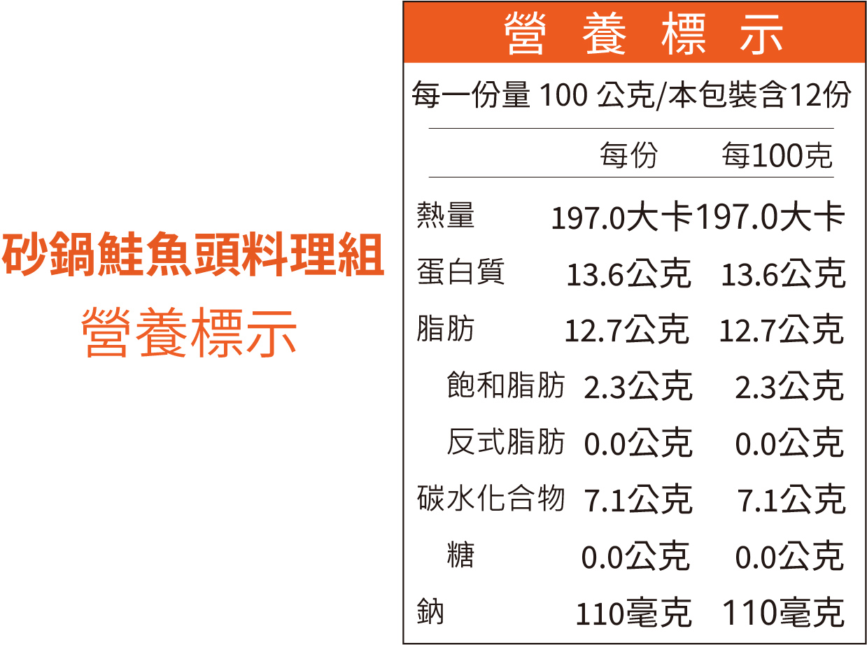 •成份丨鮭魚頭(挪威)、大白菜、金針菇、雞蛋、木耳、紅蘿蔔、魚板、蒜頭、蔥、魷魚、蝦米、台灣鯛魚丸(豬油(台灣))、玉米、芋頭、豆皮(黃豆(基因改造)、扁魚、蒜頭酥、紅蔥酥、地瓜粉、胡椒粉。