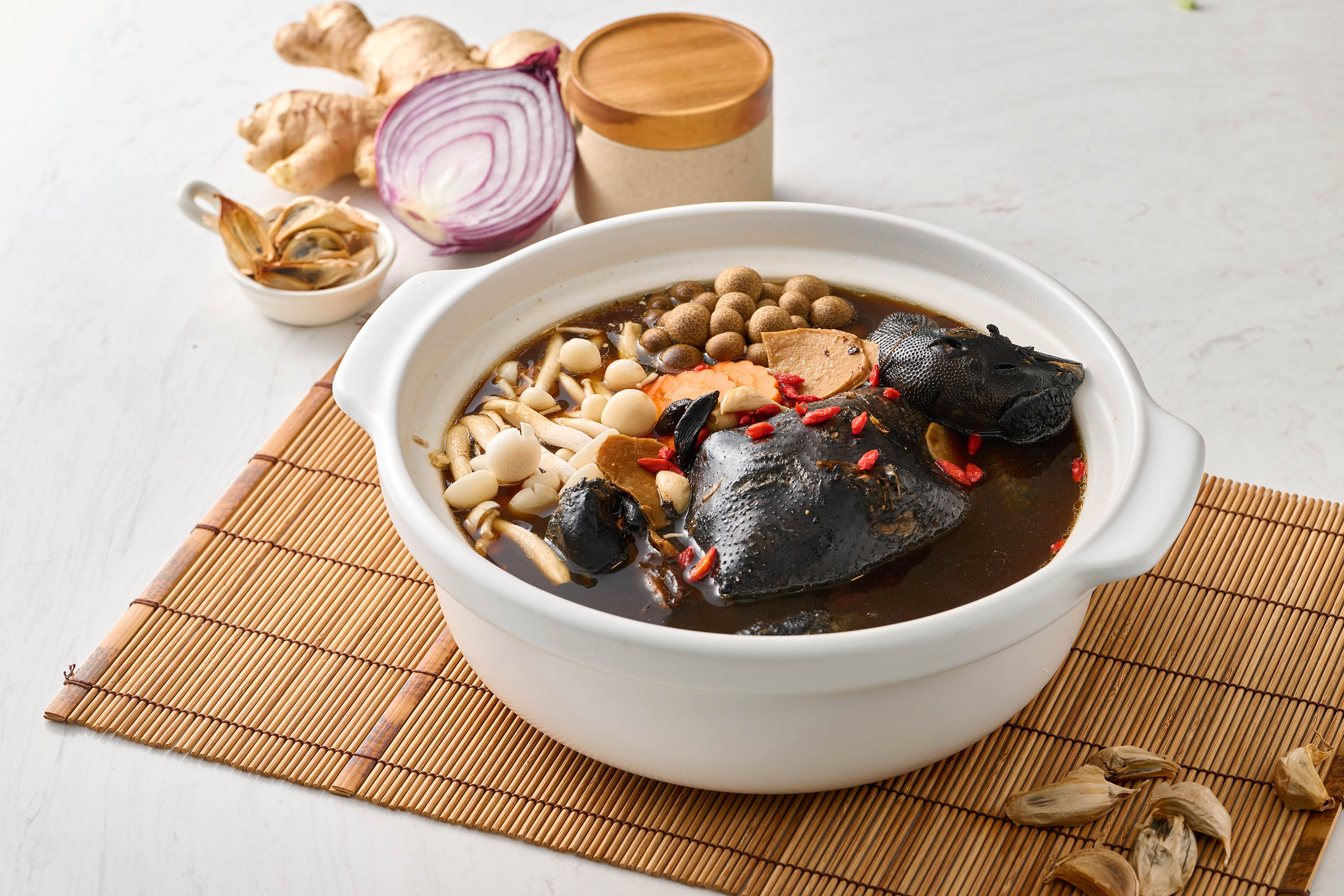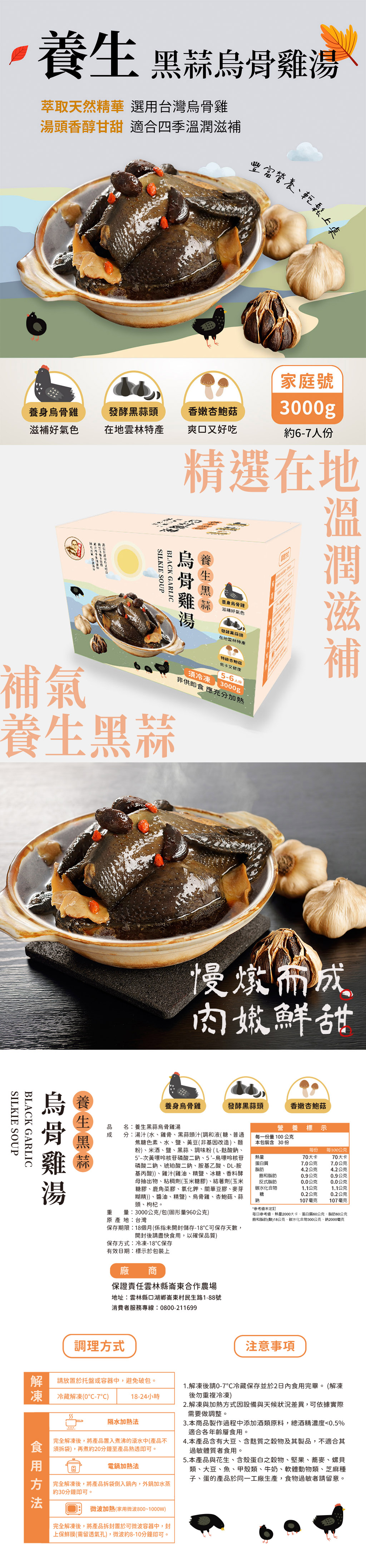成 分:湯汁 (水、雞骨、黑蒜頭汁(調和液( 糖、普通焦糖色素、水、鹽、黃豆(非基因改造)、麵粉)、米酒、鹽、黑蒜、調味粉 ( L-麩酸鈉、5’–次黃嘌呤核苷磷酸二鈉、5 ’–鳥嘌呤核苷磷酸二鈉、琥珀酸二鈉、胺基乙酸、DL-胺基丙酸))、雞汁(雞油、精鹽、冰糖、香料酵母抽出物、粘稠劑(玉米糖膠)、結著劑(玉米糖膠、鹿角菜膠、氯化鉀、關華豆膠、麥芽糊精))、醬油、精鹽)、烏骨雞、杏鮑菇、蒜頭、枸杞。