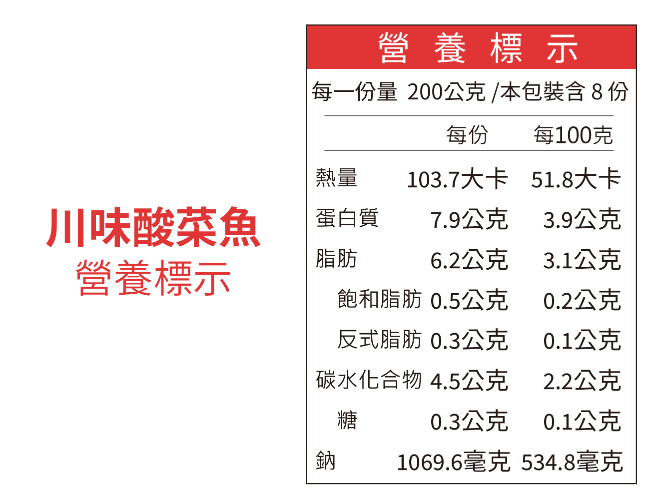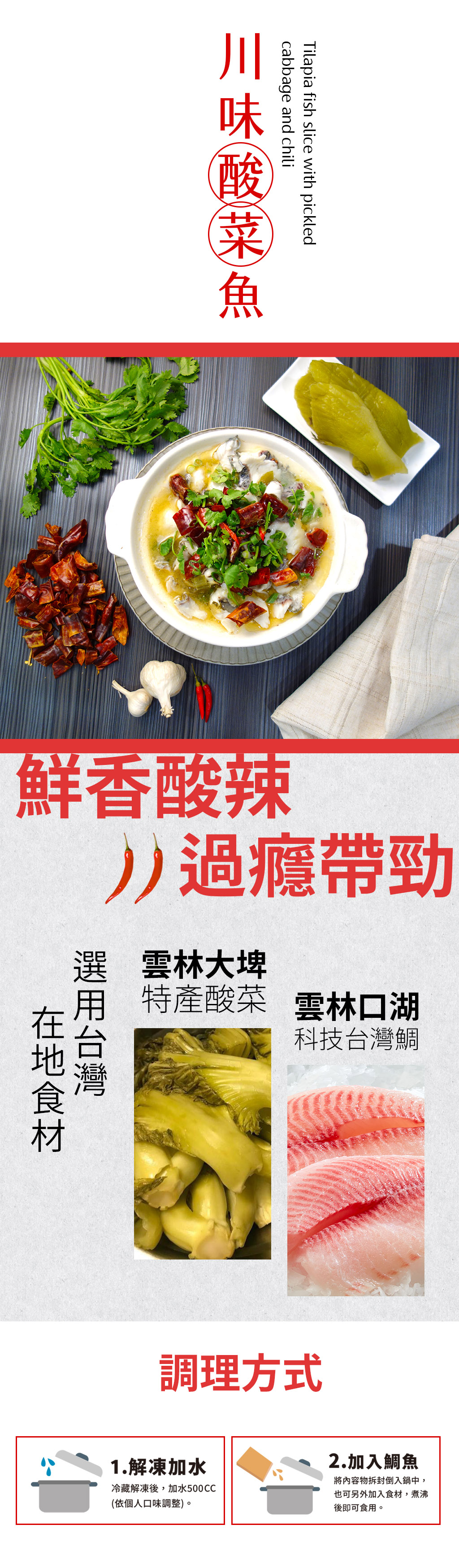 •成份丨水、台灣鯛魚、酸菜(芥菜、鹽)、大豆沙拉油、醋、蔥、雞蛋白、蒜、薑、辣椒、玉米粉、辣椒乾、鹽、花椒粒、白胡椒粉、L-麩酸鈉(調味劑)